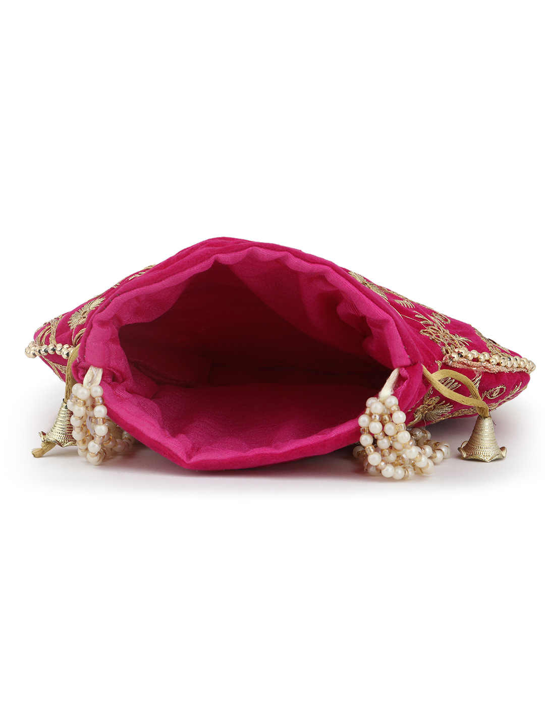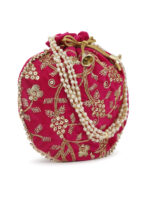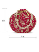 Pink embellished potli Has wrist loop 1 main compartment with drawstring closure Size & Fit Size : 9 x 9 x 3 Inch (Length x Width x Depth ) Material & Care Fabric Wipe with clean, dry cloth